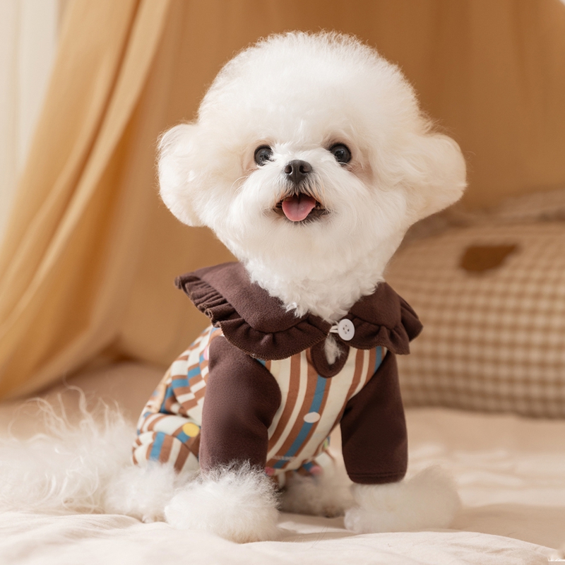 Make your furry friend the cutest pup in town with this Adorable Bear Patch Pet Onesie! Featuring a brown ruffled collar with a charming bear embroidery, striped pattern with blue and brown tones, and a cute paw print patch, this jumpsuit is full of whimsical details. The soft, comfortable fabric and snap closure make it easy to wear. Perfect for small dogs, this onesie combines style, comfort, and playful design, making it ideal for daily wear or special occasions. Let your pet embrace their cute side in this irresistible outfit!
