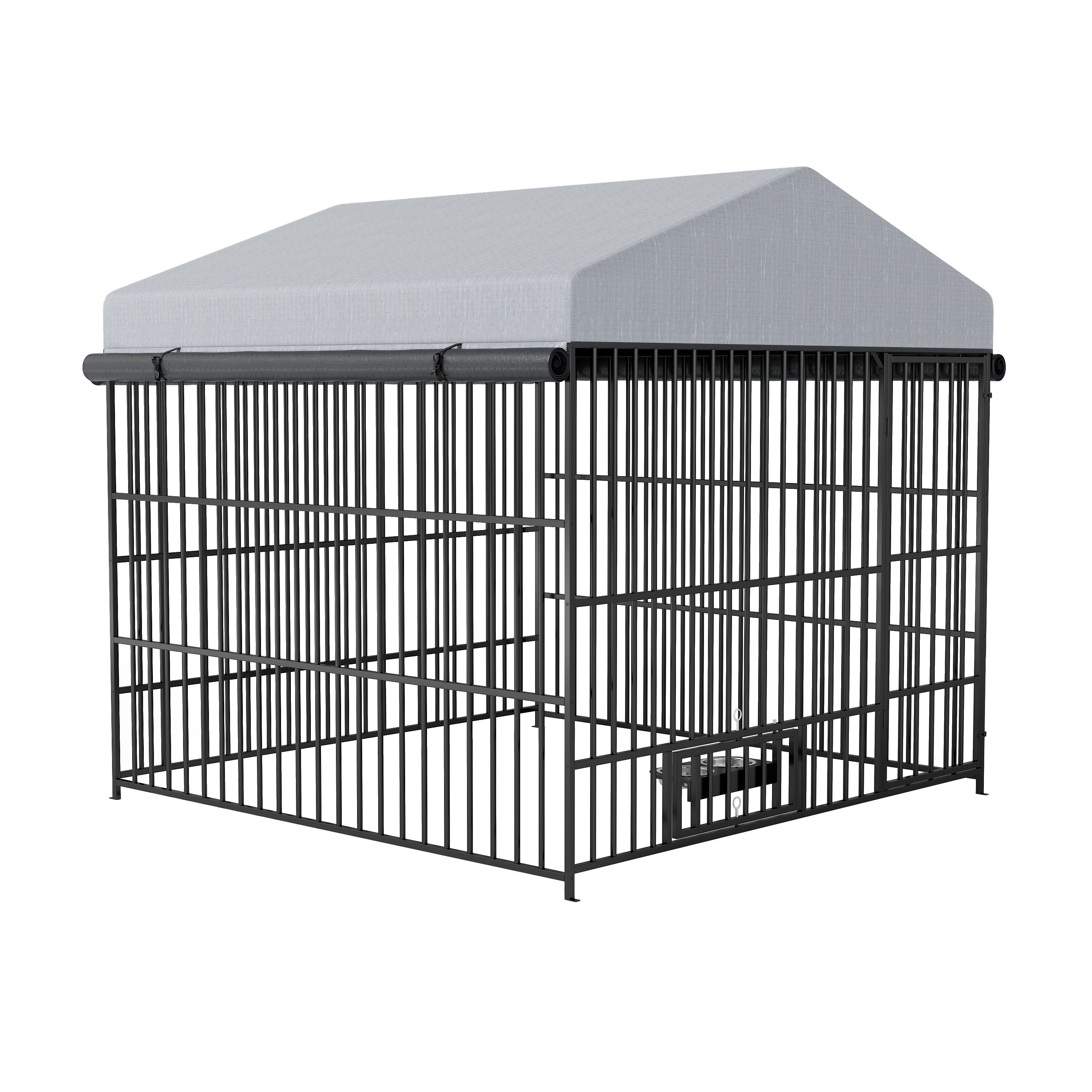 - [Upgraded Dog Kennel With Bowl] Different from other outdoor dog kennels with roof, our kennel features an upgraded design with a swivel feed lockable door, 1 bowl rack and 2 stainless steel bowls, means you can securely lock and feed your furry friends without opening the door.